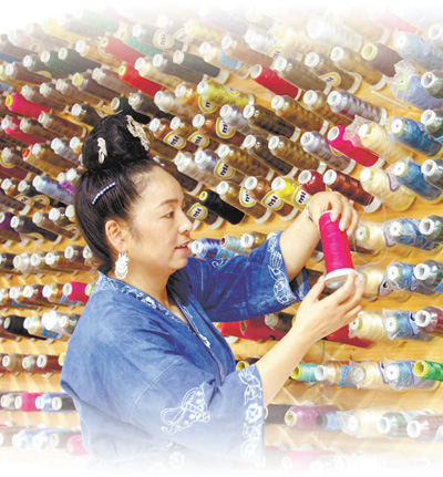 2021年9月16日,在貴州省黔東南苗族侗族自治州施秉縣舞水云臺(tái)旅游商品開發(fā)有限公司扶貧車間里,繡娘在趕制苗繡產(chǎn)品訂單。