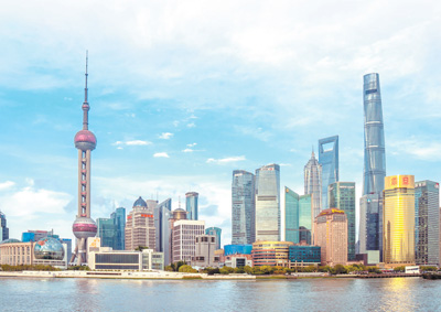 2021年4月25日,從上海外灘眺望陸家嘴,東方明珠塔、上海中心大廈等地標(biāo)建筑在藍(lán)天白云映襯下,組成優(yōu)美的城市風(fēng)景。