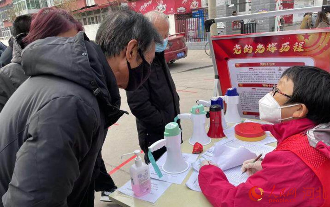 在河北省秦皇島市海港區(qū)白塔嶺街道森林逸城社區(qū)內(nèi),黨員志愿者正在維持現(xiàn)場秩序。 曹建雄攝
