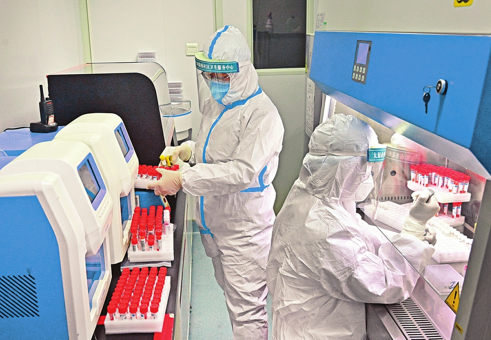 在太原市杏花嶺區(qū)壩陵橋社區(qū)衛(wèi)生服務(wù)中心PCR室,醫(yī)務(wù)人員正在對采集樣本進(jìn)行新型冠狀病毒核酸檢測。 記者劉通攝