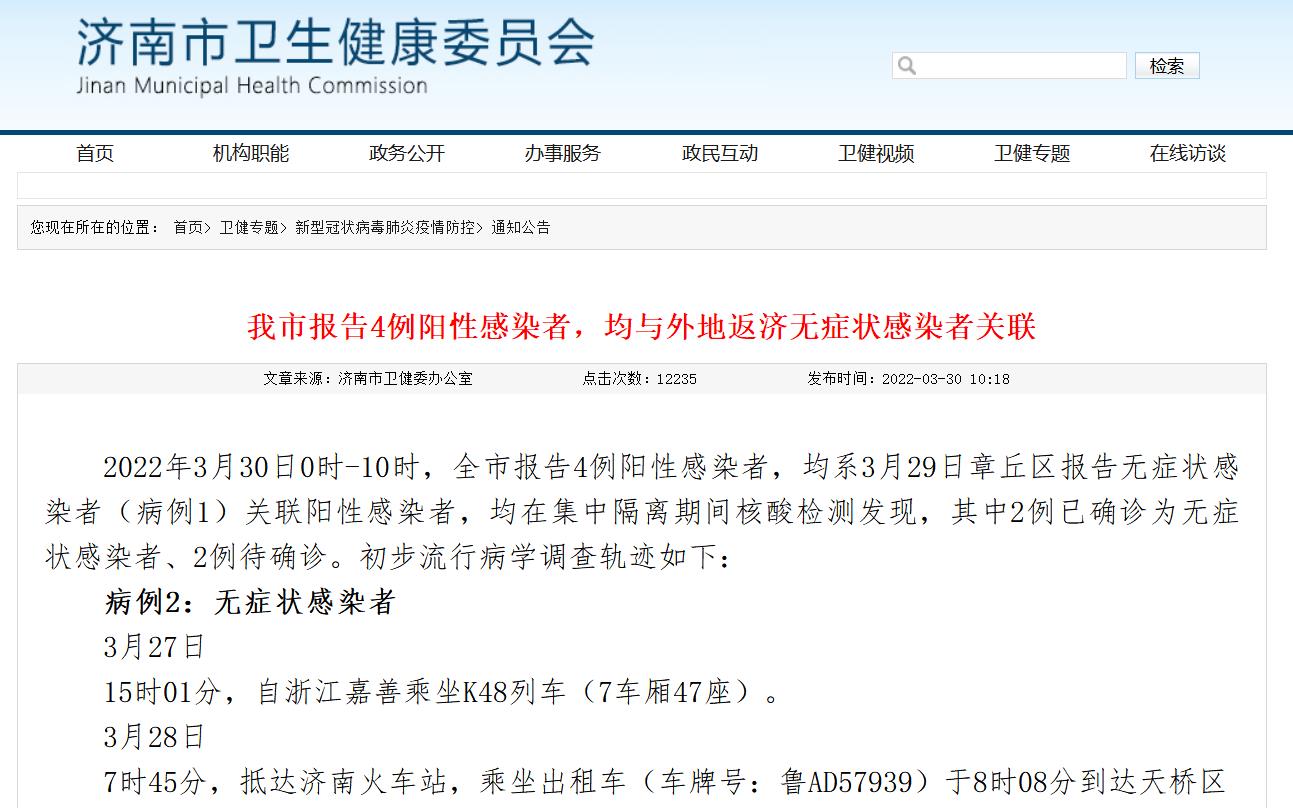 濟(jì)南市報(bào)告4例陽性感染者,均與外地返濟(jì)無癥狀感染者關(guān)聯(lián)