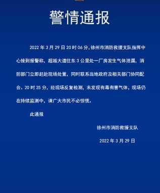 徐州市消防救援支隊在當(dāng)晚24時左右發(fā)布的警情通報中表示,3月29日20時06分,徐州市消防救援支隊指揮中心接到報警稱,超越大道往東3公里處一廠房發(fā)生氣體泄露,消防部門立即趕赴現(xiàn)場處置,同時聯(lián)系當(dāng)?shù)卣跋嚓P(guān)部門協(xié)同配合。20時25分,經(jīng)現(xiàn)場反復(fù)檢測,未發(fā)現(xiàn)有毒有害氣體,現(xiàn)場仍在持續(xù)監(jiān)測中。