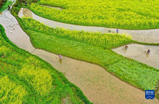 3月30日,貴州省銅仁市玉屏侗族自治縣亞魚鄉(xiāng)郭家灣村的農(nóng)民在田間勞作(無人機(jī)照片)。