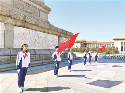 9時許,第一班少年先鋒崗隊員準時上崗,6名少先隊員佩戴鮮艷的紅領(lǐng)巾,手戴白手套,高舉中國少年先鋒隊隊旗,邁著堅定有力的步伐走向人民英雄紀念碑,以紅領(lǐng)巾的名義,為人民英雄站崗。