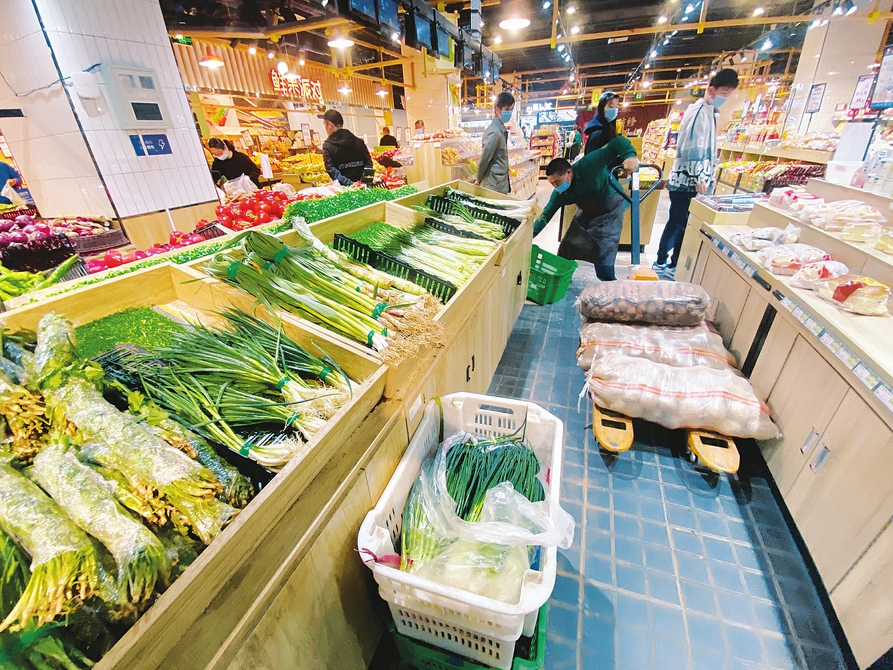 4月3日,太原市萬柏林區(qū)千峰南路一家超市內(nèi),工作人員為店內(nèi)貨架補(bǔ)貨,以保障市民正常選購。 記者阮洋攝