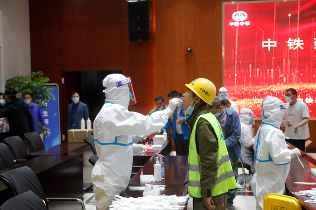 建設者在湖杭鐵路杭州西站指揮部大會議室內(nèi)做核酸檢測。周蕊攝
