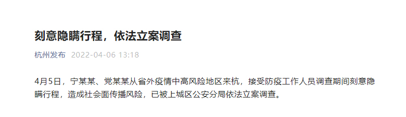兩人刻意隱瞞行程 被杭州公安依法立案調(diào)查