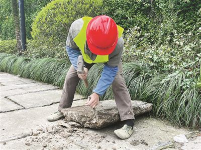“我們秉持‘最小干預(yù)’的原則——結(jié)構(gòu)層穩(wěn)定的老石板,原則上不修;需要修繕的老石板,則嚴(yán)格遵守‘修舊如舊、保留肌理’的原則?!焙贾輬@林設(shè)計(jì)院股份有限公司相關(guān)負(fù)責(zé)人介紹,“一般兩種情況下才進(jìn)行修復(fù),一是樹池周邊起拱、松動(dòng)嚴(yán)重,二是老石板破損、松動(dòng)嚴(yán)重。”