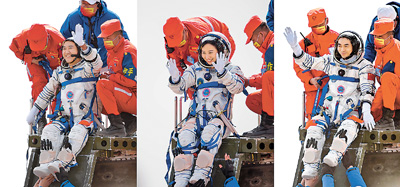 4月16日,神舟十三號載人飛船返回艙在東風著陸場成功著陸。這是航天員翟志剛、王亞平、葉光富(左至右)安全順利出艙。