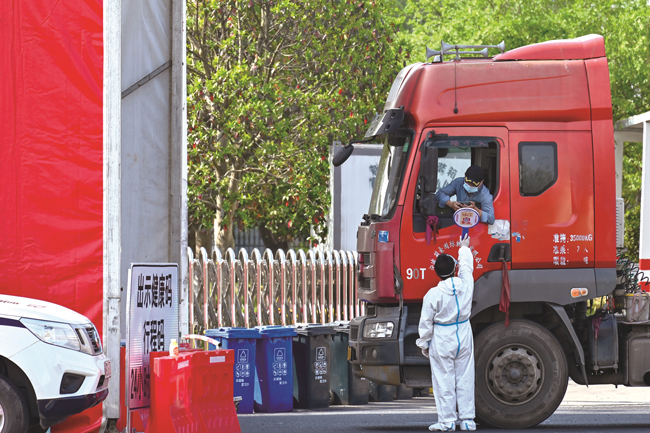 4月21日,在嘉興市嘉善縣天凝高速出入口,交警正在核驗(yàn)過往司乘人員的健康碼、行程卡、核酸檢測(cè)報(bào)告和有無途經(jīng)中高風(fēng)險(xiǎn)地區(qū)等信息,筑牢疫情防線,保障物流安全暢通。(張啟帆)