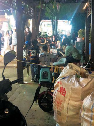 一路向西,類似的現(xiàn)象更是頻頻出現(xiàn),個(gè)別商家仍在做著“路邊攤”的生意。一名商戶告訴記者,因?yàn)辄c(diǎn)餐需要排隊(duì),所以在便道上設(shè)置了等候區(qū),掃碼點(diǎn)餐時(shí)商戶已和顧客講明,只能點(diǎn)選打包帶走。記者眼見那些餐食果真裝進(jìn)打包餐盒,送到了所謂的等候區(qū),可是顧客拿到手并未離開,打開餐盒立刻大快朵頤,顯然等候區(qū)只是給堂食外擺打了個(gè)掩護(hù)。