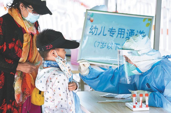 昨天(5月7日),朝陽區(qū)啟動(dòng)新一輪大規(guī)模核酸檢測。為方便居民進(jìn)行核酸采樣,減少交叉幾率,朝陽區(qū)小關(guān)街道奧林匹克文化廣場核酸檢測點(diǎn)設(shè)置“幼兒專用通道”,專為7歲以下兒童提供核酸檢測服務(wù)。本報(bào)記者 程功攝
