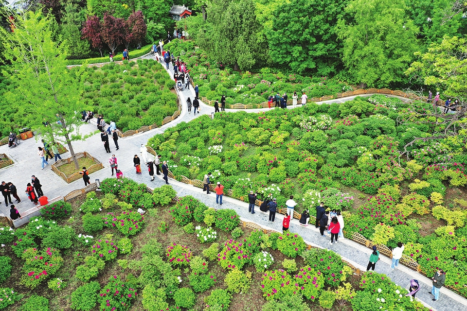 近日,太原迎澤公園牡丹園內(nèi),200多個(gè)品種、3000余株牡丹競(jìng)相盛放,吸引了不少游客前來(lái)觀賞,呈現(xiàn)出人與自然和諧相融的綠色生態(tài)畫(huà)卷。圖為5月6日,從空中鳥(niǎo)瞰太原迎澤公園牡丹園。(記者李兆民攝)