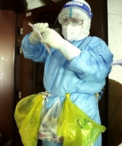 5月2日早上9點不到,劉彩麗來到小區(qū)門口,穿戴好防護服,腰上綁好采樣工具包、消毒用具,進入封控區(qū)為居民進行核酸采樣。小區(qū)是5層的老舊樓房,沒有電梯,裹著防護服的劉彩麗爬上頂樓時已經(jīng)氣喘吁吁,倚著欄桿平穩(wěn)了一下呼吸,輕輕敲著居民門,準備投入采樣工作。經(jīng)過多輪核酸采樣,劉彩麗和居民早已熟稔。