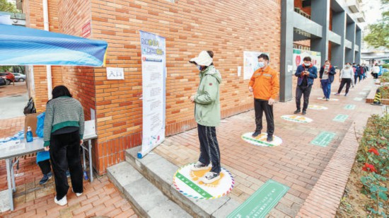 本報(bào)訊(記者 李瑤)昨天,東城區(qū)東四街道在轄區(qū)內(nèi)5個(gè)常態(tài)化核酸檢測(cè)點(diǎn)推出新式“兩米線”,通過(guò)充滿童趣的“呼啦圈”地貼,引導(dǎo)居民有序排隊(duì),保持安全距離?!昂衾踩Α敝睆酱蠹s80厘米,中間黃色腳印圖案十分醒目,旁邊還印有疫情防控科普貼,居民站在圈內(nèi)有序排隊(duì)等待核酸檢測(cè)?!啊粌H富有童趣,使排隊(duì)等候不再那么乏味,還嚴(yán)格規(guī)定了排隊(duì)距離,保證大家的安全?!本用顸c(diǎn)贊說(shuō)。本報(bào)記者 鄧偉攝