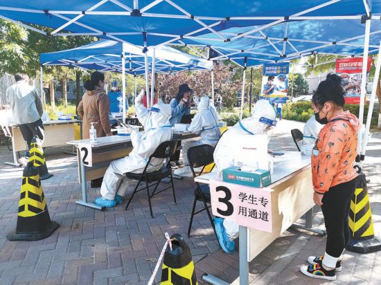 昨天,石景山區(qū)古城街道燕堤中街社區(qū)核酸檢測點設(shè)有學(xué)生檢測專用通道,方便學(xué)生隨來隨檢,不耽誤上網(wǎng)課。本報記者 吳鏑攝
