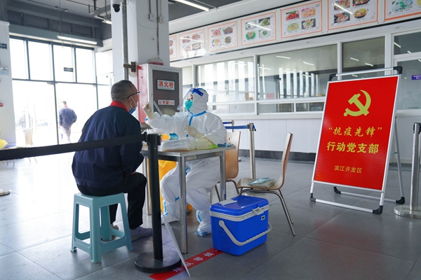 核酸檢測(cè)團(tuán)隊(duì)走進(jìn)制造業(yè)企業(yè)。濱江開發(fā)區(qū)供圖