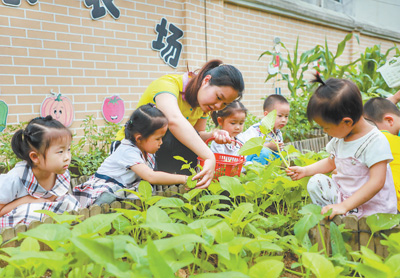 江西省贛州市全南縣幼兒園通過開展“合理營養(yǎng)與健康飲食”主題教育活動,引導孩子們均衡營養(yǎng)、珍惜糧食。圖為老師在幼兒園快樂農(nóng)場教小朋友們采摘蔬菜。