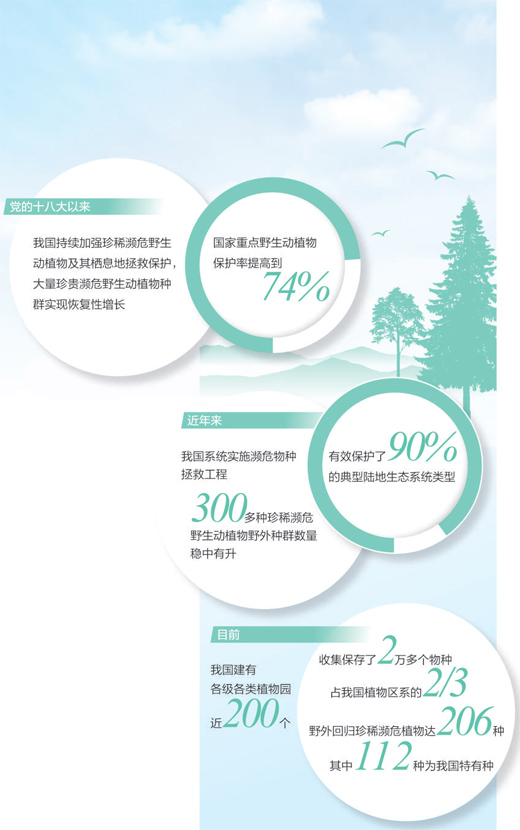 近年來,我國(guó)系統(tǒng)實(shí)施瀕危物種拯救工程,采取就地保護(hù)、遷地保護(hù)、放歸(回歸)自然、人工繁育(培植)等措施,有效保護(hù)了90%的典型陸地生態(tài)系統(tǒng)類型,300多種珍稀瀕危野生動(dòng)植物野外種群數(shù)量穩(wěn)中有升。目前,我國(guó)建有各級(jí)各類植物園近200個(gè),收集保存了2萬多個(gè)物種,占我國(guó)植物區(qū)系的2/3。野外回歸珍稀瀕危植物達(dá)到206種,其中112種為我國(guó)特有種。麋鹿、普氏野馬曾一度在野外消失,目前通過人工繁育等方式,總數(shù)分別達(dá)近1萬只和700只左右,并成功實(shí)施放歸自然,重新建立了野外種群,生存區(qū)域和范圍不斷擴(kuò)大。