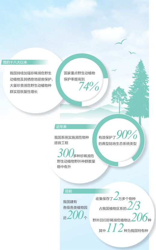 近年來(lái),我國(guó)系統(tǒng)實(shí)施瀕危物種拯救工程,采取就地保護(hù)、遷地保護(hù)、放歸(回歸)自然、人工繁育(培植)等措施,有效保護(hù)了90%的典型陸地生態(tài)系統(tǒng)類(lèi)型,300多種珍稀瀕危野生動(dòng)植物野外種群數(shù)量穩(wěn)中有升。目前,我國(guó)建有各級(jí)各類(lèi)植物園近200個(gè),收集保存了2萬(wàn)多個(gè)物種,占我國(guó)植物區(qū)系的2/3。野外回歸珍稀瀕危植物達(dá)到206種,其中112種為我國(guó)特有種。麋鹿、普氏野馬曾一度在野外消失,目前通過(guò)人工繁育等方式,總數(shù)分別達(dá)近1萬(wàn)只和700只左右,并成功實(shí)施放歸自然,重新建立了野外種群,生存區(qū)域和范圍不斷擴(kuò)大。