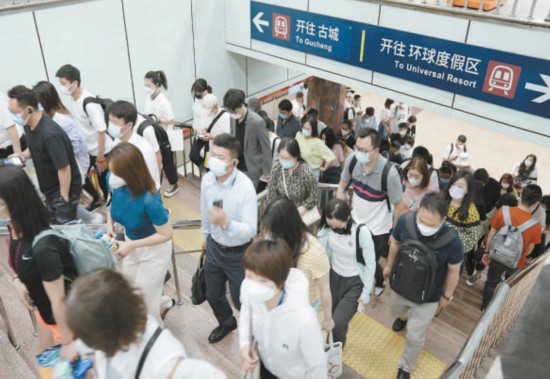 昨天早上八點(diǎn)半左右,地鐵國貿(mào)站呈現(xiàn)早高峰趨勢。 本報(bào)記者 劉平攝
