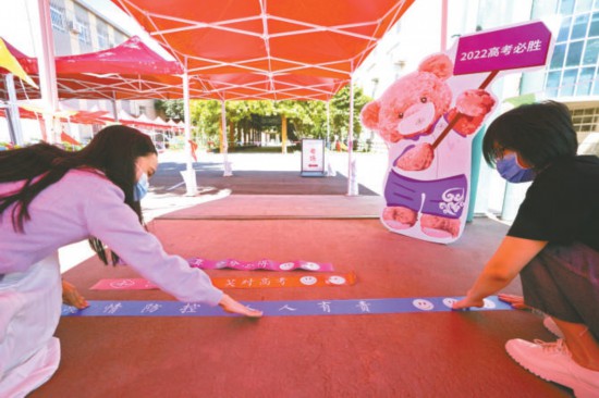 昨天上午,中國地質(zhì)大學(xué)附屬中學(xué)考點(diǎn)正在進(jìn)行考點(diǎn)布置工作。兩米線上除了疫情提示,還印有“沉著冷靜 笑對(duì)高考”“自信認(rèn)真 分分必得”等祝福語。本報(bào)記者 王海欣攝