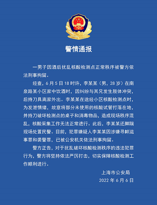 人民網(wǎng)上海6月6日電 (王文娟)據(jù)上海市公安局通報(bào),一男子因酒后擾亂核酸檢測點(diǎn)正常秩序被警方依法刑事拘留。