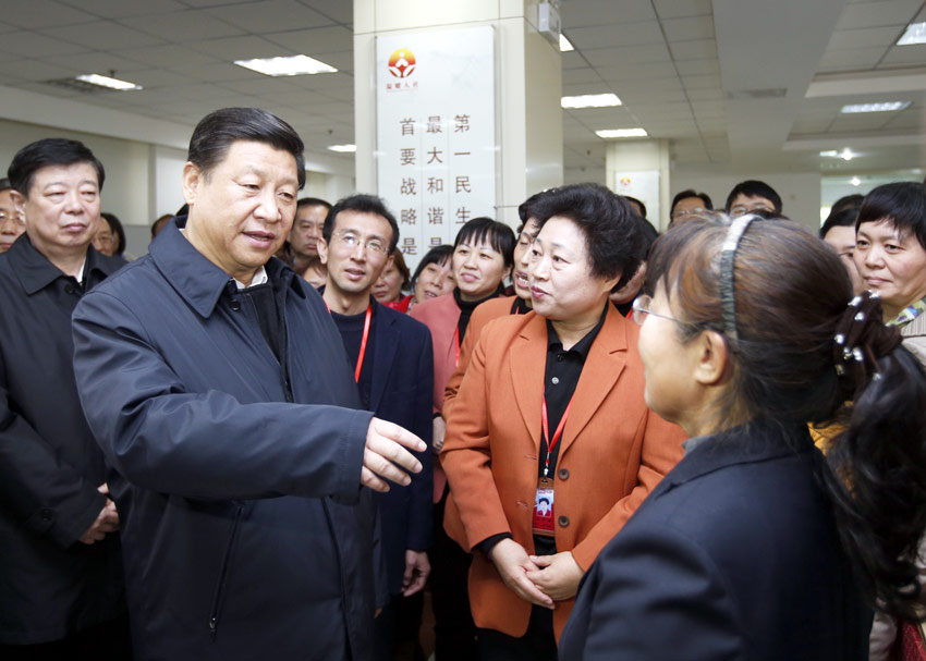 2013年11月27日下午,中共中央總書(shū)記、國(guó)家主席、中央軍委主席習(xí)近平在濟(jì)南市外來(lái)務(wù)工人員綜合服務(wù)中心同從事家政服務(wù)的“陽(yáng)光大姐”交流。新華社記者鞠鵬攝