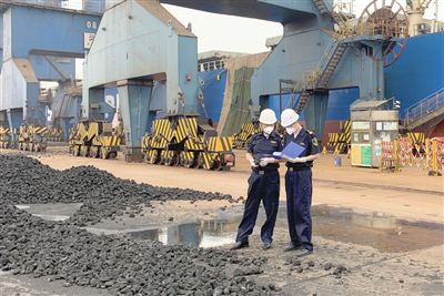 海關(guān)關(guān)員對焦炭進行現(xiàn)場監(jiān)管。天津海關(guān)供圖