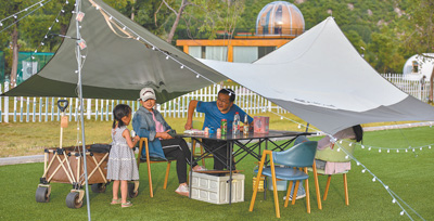 “三五好友結伴而行,喝茶賞景,好不愜意?!背虝哉f,“現(xiàn)在市場上有很多比較成熟的露營產品可選擇,有的只提供帳篷等設備,需要自備餐食,有的是全包,吃住游所需都準備好了,還有些個性化的產品會提供桌游、羽毛球等休閑項目?!痹隗w驗過幾次露營后,程曉正打算帶上父母一起戶外郊游。