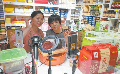 江西鷹潭市余江區(qū)大力推廣網絡購物、直播帶貨等消費模式,本地茄子干、紅薯粉絲等綠色農產品搭上網絡快車,走上百姓餐桌。圖為余江區(qū)益農電商運營中心經理于小葵(左)在店里直播帶貨。