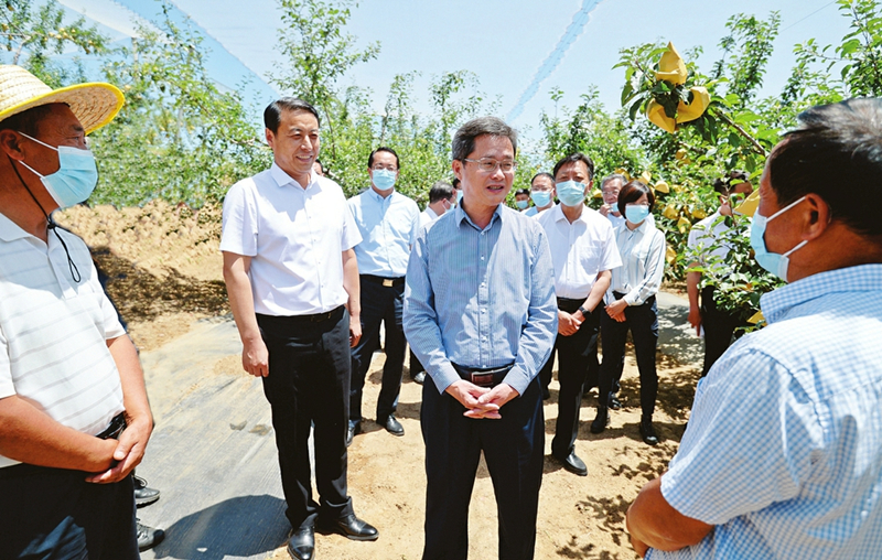 6月14日,省委副書(shū)記、省長(zhǎng)、省總河長(zhǎng)藍(lán)佛安來(lái)到吉縣柏山寺鄉(xiāng)“雙千畝”蘋(píng)果高新示范基地,與專(zhuān)業(yè)果樹(shù)種植戶(hù)親切交談,詳細(xì)了解基地建設(shè)及生產(chǎn)營(yíng)銷(xiāo)開(kāi)發(fā)等情況。 本報(bào)記者李兆民攝