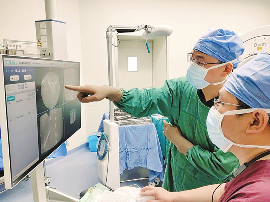 近日,山西醫(yī)科大學第二醫(yī)院趙斌教授、趙軼波副主任醫(yī)師團隊完成省內首例脊柱機器人導航可視化置釘手術,耗時2小時,出血量僅50毫升,患者術后恢復良好,第3天可下床活動。手術在機器人的輔助下,精準有效置入椎弓根螺釘,縮短了手術時間,有效控制術中出血,顯著減少了放射線對醫(yī)生和患者的輻射,極大提高了手術效率和安全性。(周慧芳 高志國圖/文)