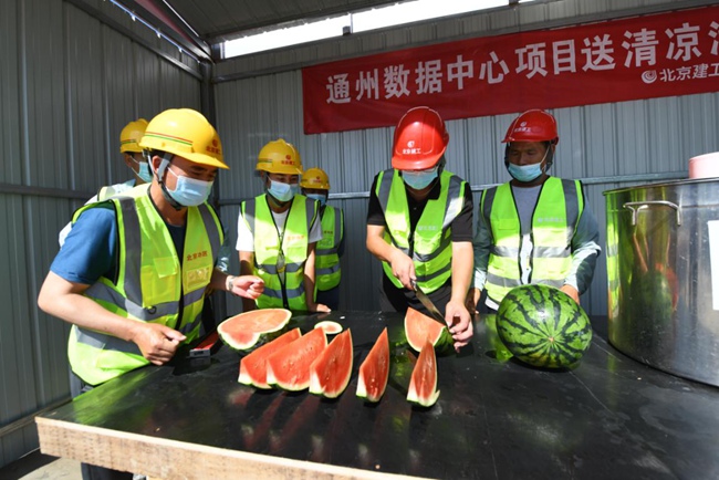 在通州數(shù)據(jù)中心項(xiàng)目頂板鋪設(shè)施工現(xiàn)場,高溫對奮戰(zhàn)在施工一線的員工來說無疑是一場巨大的“烤驗(yàn)”?!半m然現(xiàn)場的溫度達(dá)到了38℃,但是項(xiàng)目部合理調(diào)配時(shí)間,對現(xiàn)場的防暑降溫工作做了全面部署,施工現(xiàn)場配備了西瓜、綠豆湯、藿香正氣水和清涼油等防暑物資,在場邊設(shè)置了遮陽涼棚,并且讓施工人員避開上10點(diǎn)到下午3點(diǎn)的高溫期錯(cuò)時(shí)上崗,保證現(xiàn)場安全生產(chǎn)的同時(shí)也盡量不耽誤項(xiàng)目進(jìn)度?!表?xiàng)目部負(fù)責(zé)人胡永忠說。