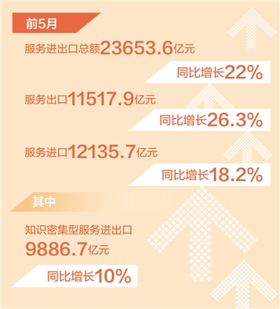 知識密集型服務貿(mào)易穩(wěn)定增長。前5月,知識密集型服務進出口9886.7億元,同比增長10%。其中,知識密集型服務出口5602.4億元,增長13.6%;出口增長較快的領域是電信計算機和信息服務、其他商業(yè)服務,分別增長18.5%、13.2%。知識密集型服務進口4284.3億元,增長5.6%;進口增長較快的領域是保險服務,增速達74.2%。