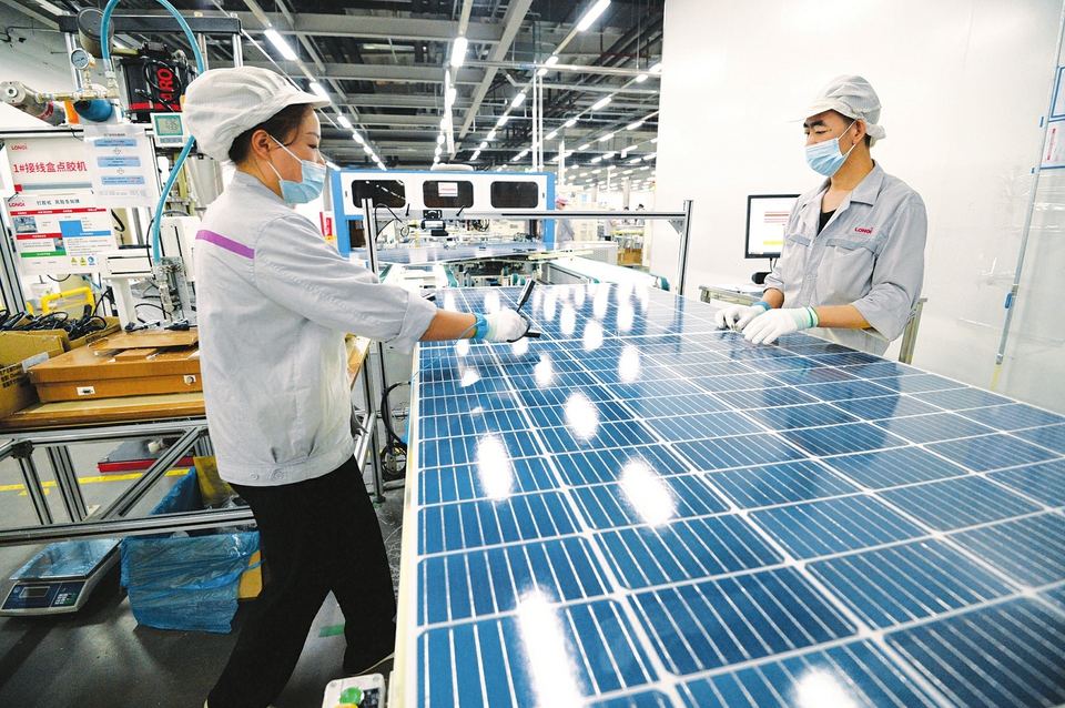 7月15日,大同隆基光伏科技有限公司光伏面板生產(chǎn)線上,工人們正在對產(chǎn)品進(jìn)行最后檢測。該公司規(guī)劃布局了3條自動化生產(chǎn)線,引入目前行業(yè)內(nèi)先進(jìn)的生產(chǎn)設(shè)備和技術(shù)工藝。全部建成投產(chǎn)后,預(yù)計年產(chǎn)值約30億元。(記者李兆民攝)