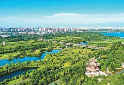 圖一:藍(lán)綠交織的永定河北京豐臺(tái)段。本報(bào)記者 賀 勇攝