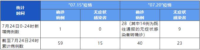 “07.15”疫情新增本土確診病例1例,無新增本土無癥狀感染者,系隔離管控中的密切接觸者。截至24日24時,本起疫情累計(jì)報告本土確診病例59例、本土無癥狀感染者15例。