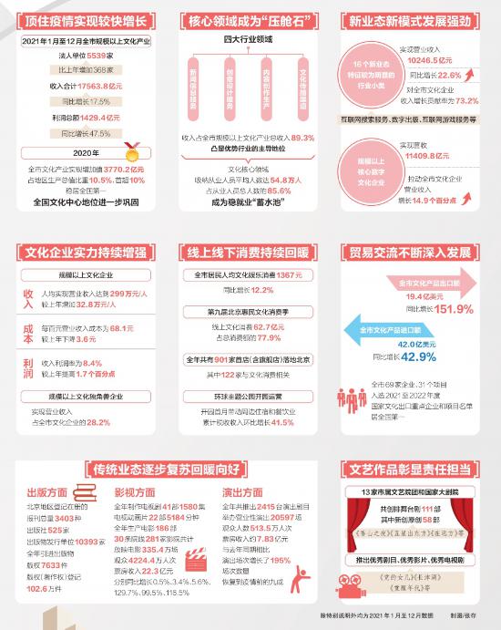 2021年是“十四五”開局之年,北京文化產(chǎn)業(yè)發(fā)展圍繞落實習(xí)近平總書記關(guān)于文化建設(shè)的重要論述,服務(wù)國家文化發(fā)展戰(zhàn)略,立足推進全國文化中心建設(shè),以高質(zhì)量發(fā)展為主線,在疫情防控常態(tài)化形勢下,積極主動應(yīng)變求新、穩(wěn)中求進,實現(xiàn)了“十四五”時期的良好開局。