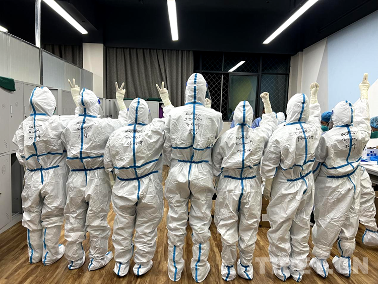 圖為拉薩市第二座方艙醫(yī)院醫(yī)護人員們正在穿防護服準備開始一天的工作 攝影:次仁卓瑪