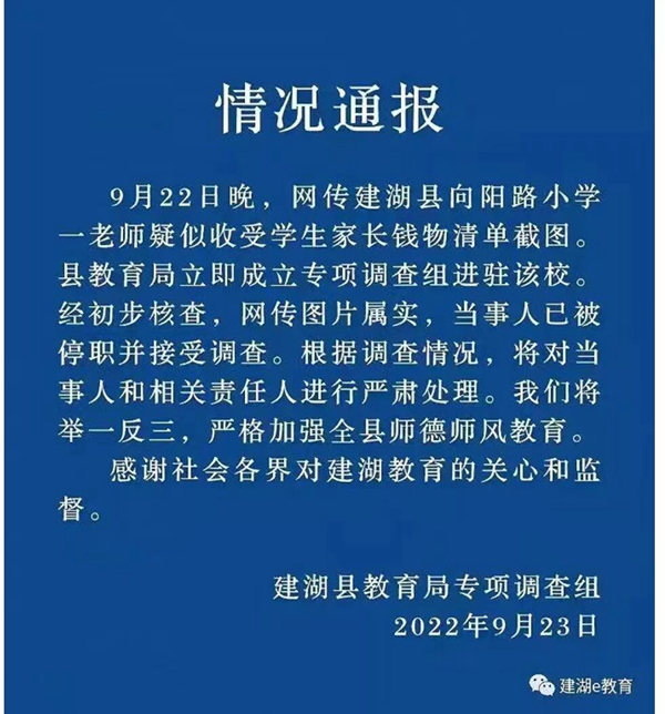 人民網(wǎng)南京9月23日電 (王丹丹)據(jù)“建湖e教育”微信公眾號(hào)消息,江蘇鹽城建湖縣教育局專項(xiàng)調(diào)查組發(fā)布情況通報(bào),9月22日晚,網(wǎng)傳建湖縣向陽路小學(xué)一老師疑似收受學(xué)生家長錢物清單截圖,縣教育局立即成立專項(xiàng)調(diào)查組進(jìn)駐該校。
