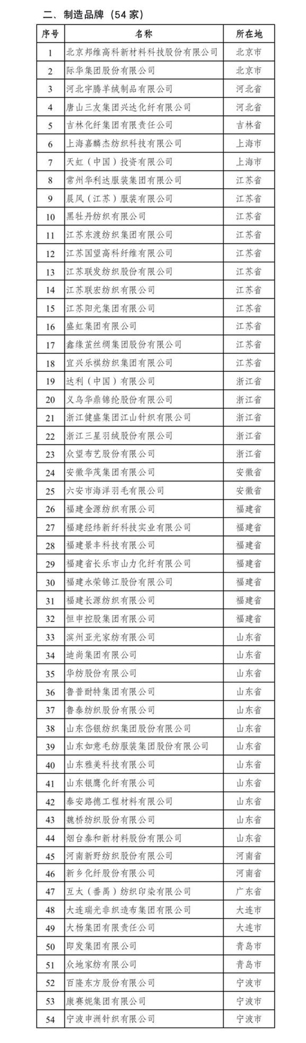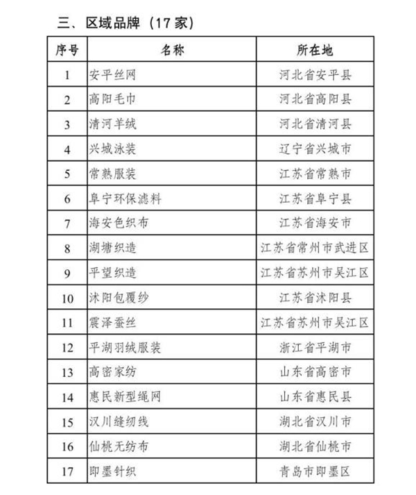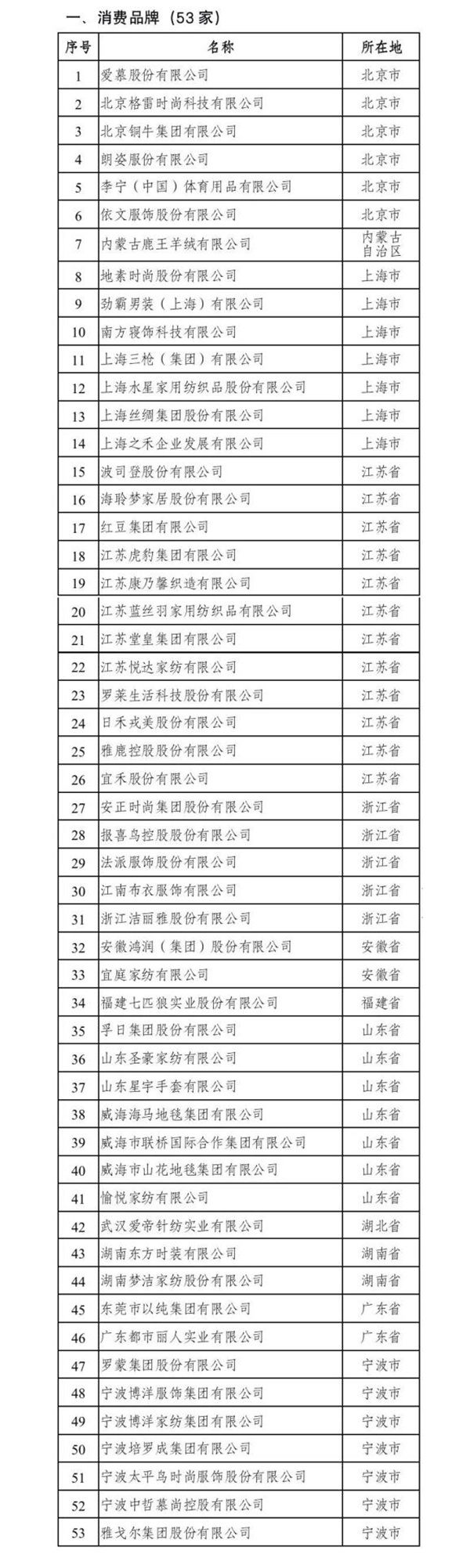 此次入選的江蘇消費品牌包括波司登、海聆夢家居、紅豆、虎豹、康乃馨、藍絲羽、堂皇、悅達家紡、羅萊、日禾戎美、雅鹿、宜禾等。制造品牌包括常州華利達、晨風、黑牡丹紡織、東渡紡織、國望高科纖維、聯(lián)發(fā)紡織、聯(lián)宏紡織、陽光、盛虹、鑫緣、宜興樂祺等。區(qū)域品牌包括常熟服裝、阜寧環(huán)保濾料、海安色織布、湖塘織造、平望織造、沭陽包覆紗、震澤蠶絲等。