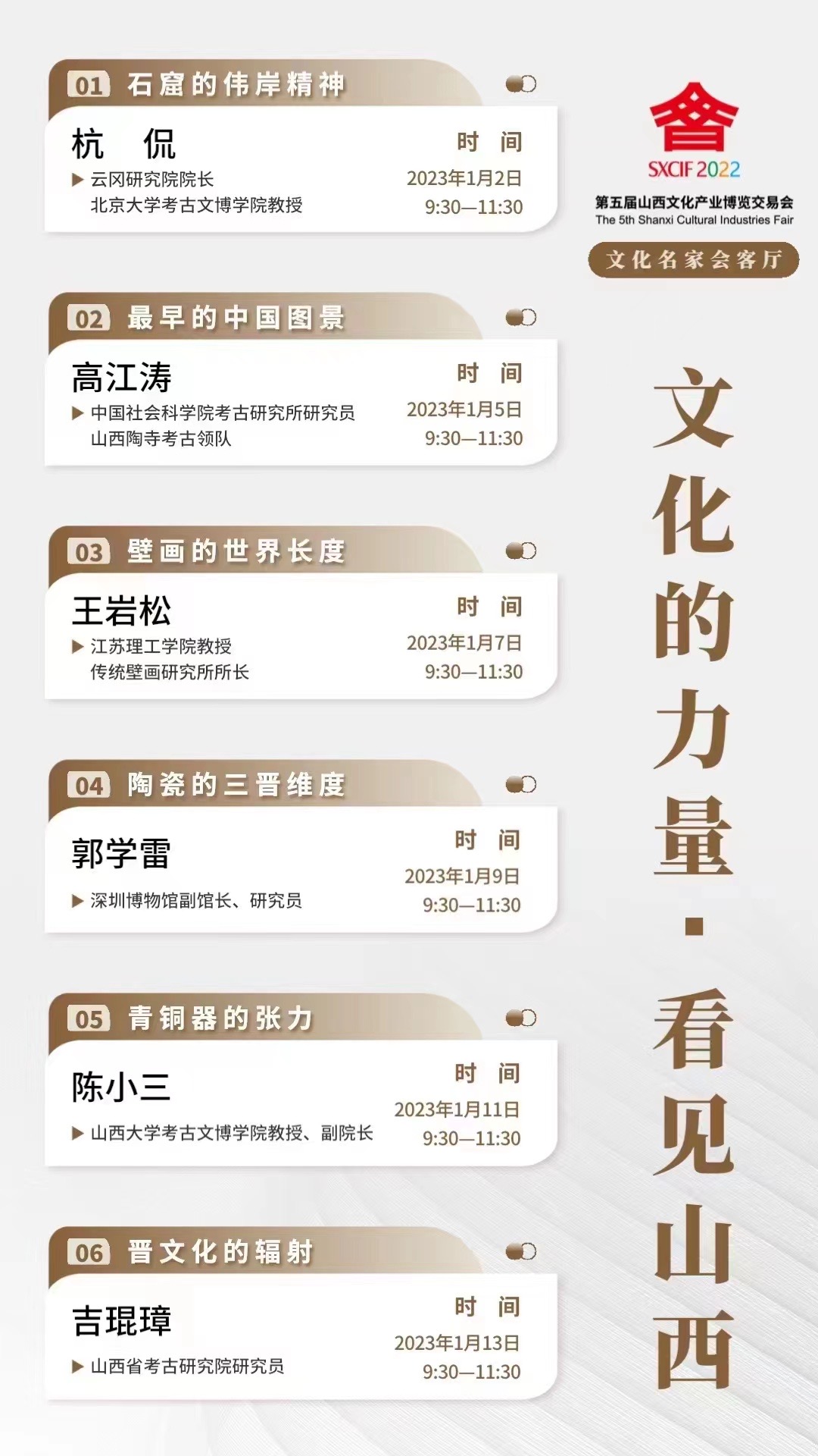 山西歷史悠久,文化資源深厚,在豐富的歷史遺存里,留存有無數(shù)山西智慧、山西力量。本次“文化名家會(huì)客廳”就是以“文化的力量·看見山西”為主題,從組成山西文化的文博、考古元素入手,邀請(qǐng)6位在全國(guó)有影響的專家進(jìn)行線上講座,以各自不同的空間和文化視角,分列主題,對(duì)山西文化資源進(jìn)行分析觀照,探討如何更好、更深、更有效地發(fā)掘當(dāng)下有利于彰顯山西文化的優(yōu)質(zhì)要素,助力山西文化事業(yè)高質(zhì)量發(fā)展。