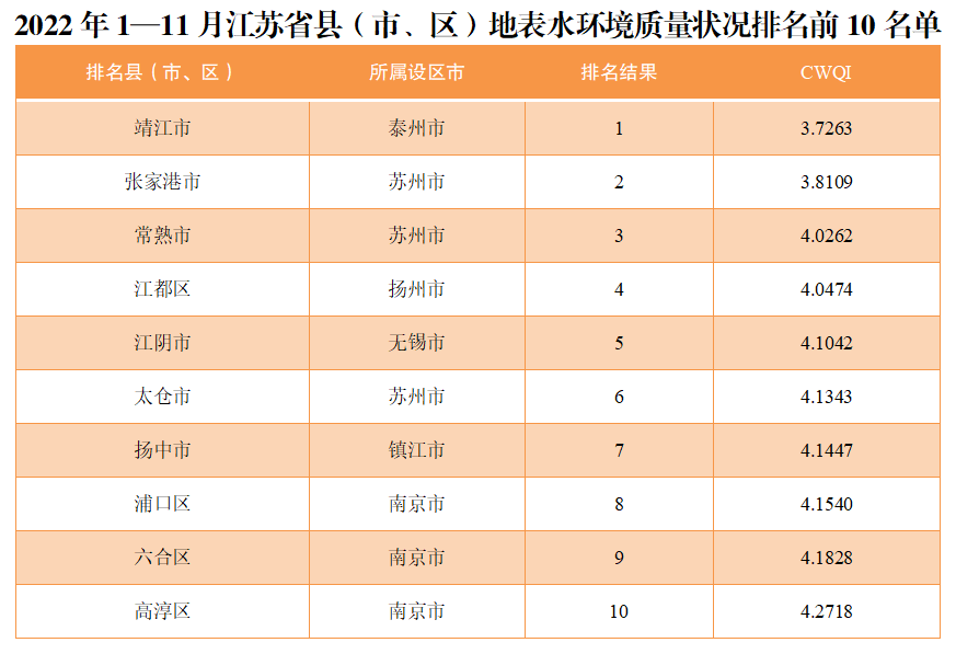具體看來,2022年1—11月,63個(gè)縣(市、區(qū))中,地表水環(huán)境質(zhì)量相對較好的前10位(1—10名)依次是靖江市、張家港市、常熟市、江都區(qū)、江陰市、太倉市、揚(yáng)中市、浦口區(qū)、六合區(qū)、高淳區(qū)。相對較差的后10位(倒1—10名)依次是銅山區(qū)、漣水縣、豐縣、泗洪縣、東??h、贛榆區(qū)、洪澤區(qū)、沭陽縣、金湖縣、淮陰區(qū)。