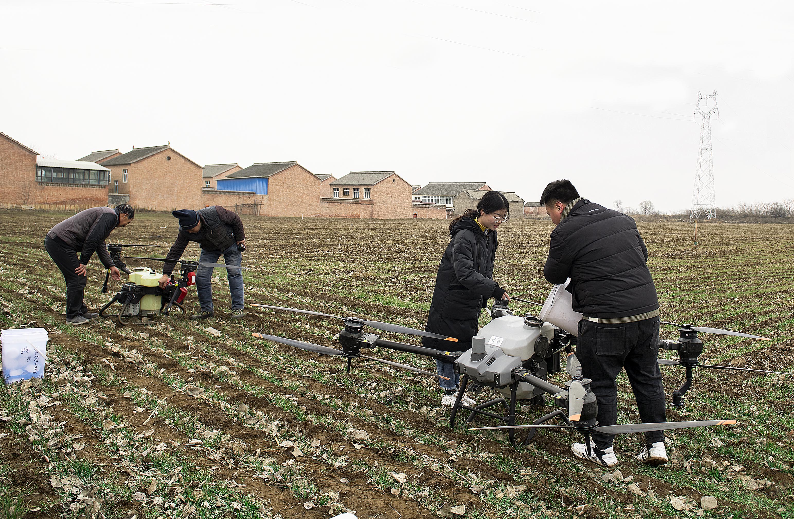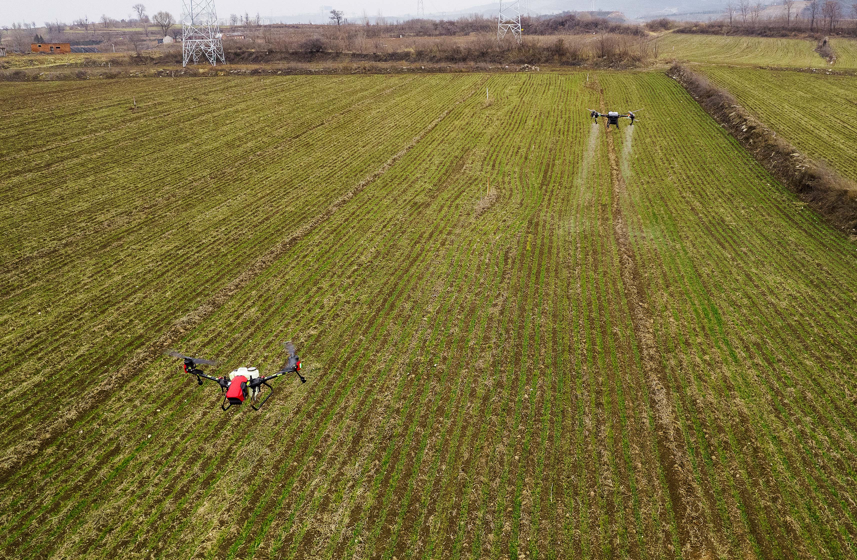 2月15日,在晉城市城區(qū)南村鎮(zhèn),操作員正熟練地遙控農(nóng)業(yè)專用無(wú)人機(jī)給麥田播撒肥料,大大提高了工作效率。