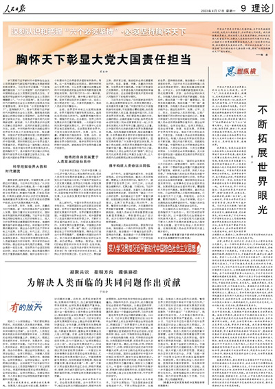 中國共產(chǎn)黨是為中國人民謀幸福、為中華民族謀復(fù)興的黨,也是為人類謀進(jìn)步、為世界謀大同的黨。我們要拓展世界眼光,深刻洞察人類發(fā)展進(jìn)步潮流,積極回應(yīng)各國人民普遍關(guān)切,為解決人類面臨的共同問題作出貢獻(xiàn),以海納百川的寬闊胸襟借鑒吸收人類一切優(yōu)秀文明成果,推動(dòng)建設(shè)更加美好的世界。深刻認(rèn)識和把握“六個(gè)必須堅(jiān)持”系列理論版今天推出第六期,圍繞“必須堅(jiān)持胸懷天下”進(jìn)行闡述。