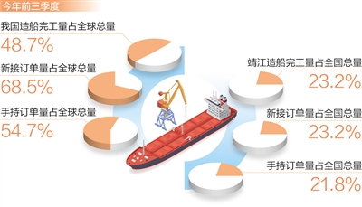 今年前三季度,我國造船完工量、新接訂單量和手持訂單量以載重噸計(jì)分別占全球總量的48.7%、68.5%和54.7%,均居世界第一。在江蘇泰州靖江市,當(dāng)?shù)卦齑髽I(yè)的訂單排到了2026年,成為我國船舶業(yè)轉(zhuǎn)型升級、穩(wěn)步向好的縮影。