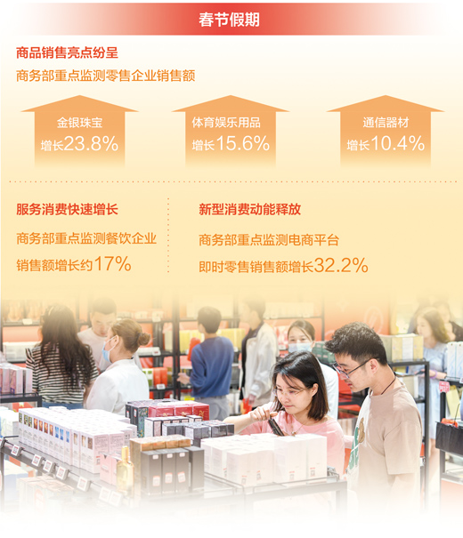 數(shù)據(jù)顯示,春節(jié)假期商品銷售亮點(diǎn)紛呈。春節(jié)假期,節(jié)慶商品、國(guó)貨潮品、綠色智能產(chǎn)品等持續(xù)旺銷。商務(wù)部重點(diǎn)監(jiān)測(cè)零售企業(yè)金銀珠寶、體育娛樂(lè)用品、通信器材銷售額同比分別增長(zhǎng)23.8%、15.6%和10.4%。