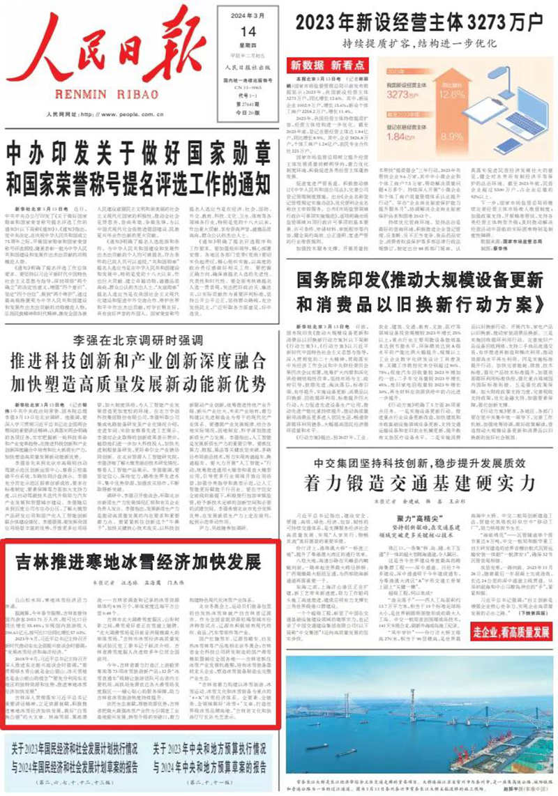 人民日報頭版聚焦吉林:寒地冰雪經(jīng)濟加快發(fā)展