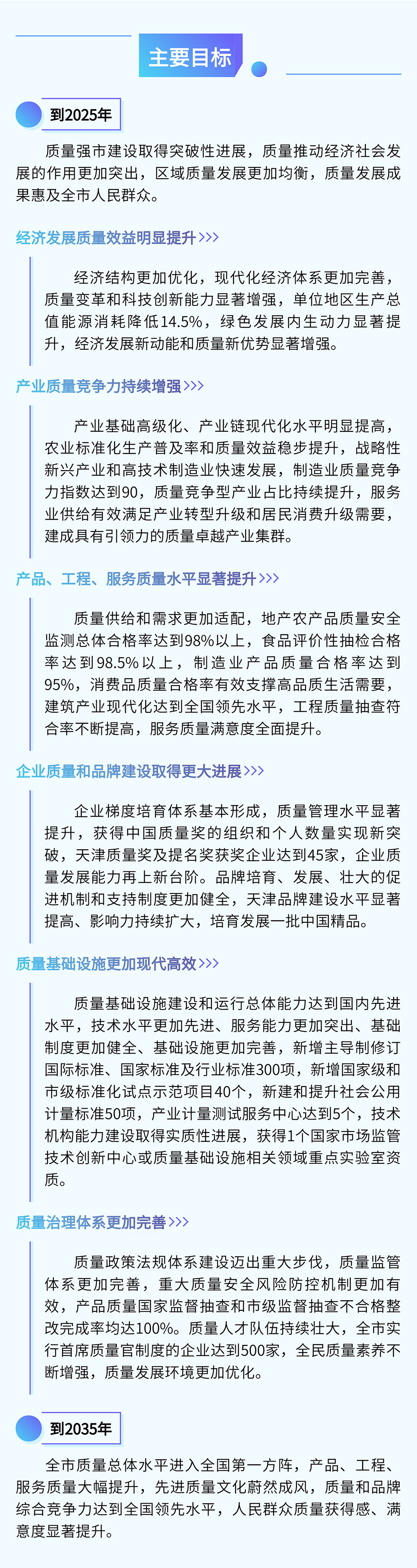同時(shí),《綱要》聚焦高質(zhì)量發(fā)展,落實(shí)質(zhì)量強(qiáng)國(guó)部署要求?!顿|(zhì)量強(qiáng)國(guó)建設(shè)綱要》首次將質(zhì)量工作范疇從產(chǎn)品、工程、服務(wù)等微觀質(zhì)量領(lǐng)域,拓展到經(jīng)濟(jì)、產(chǎn)業(yè)、區(qū)域等宏觀質(zhì)量領(lǐng)域。按照貫徹《質(zhì)量強(qiáng)國(guó)建設(shè)綱要》精神不走樣、落實(shí)重大部署不漏項(xiàng)的原則,《綱要》結(jié)合全市發(fā)展現(xiàn)狀和客觀需求,相應(yīng)部署了推動(dòng)經(jīng)濟(jì)質(zhì)量效益型發(fā)展、增強(qiáng)產(chǎn)業(yè)和區(qū)域質(zhì)量競(jìng)爭(zhēng)力、加快產(chǎn)品質(zhì)量創(chuàng)新升級(jí)、推動(dòng)建設(shè)工程品質(zhì)化升級(jí)、促進(jìn)服務(wù)供給擴(kuò)容提質(zhì)、增強(qiáng)企業(yè)質(zhì)量和品牌發(fā)展能力、建設(shè)高水平質(zhì)量基礎(chǔ)設(shè)施、構(gòu)建現(xiàn)代高效質(zhì)量治理體系等8項(xiàng)具體任務(wù)。同時(shí),為確保各項(xiàng)重點(diǎn)任務(wù)落地落實(shí),同步設(shè)置了7個(gè)專(zhuān)欄,明確實(shí)施產(chǎn)業(yè)質(zhì)量競(jìng)爭(zhēng)力提升、重點(diǎn)產(chǎn)品質(zhì)量階梯攀登、建設(shè)工程質(zhì)量管理升級(jí)、服務(wù)品質(zhì)提升、天津品牌建設(shè)、質(zhì)量基礎(chǔ)設(shè)施能力提升、質(zhì)量安全監(jiān)管現(xiàn)代化等7項(xiàng)工程。